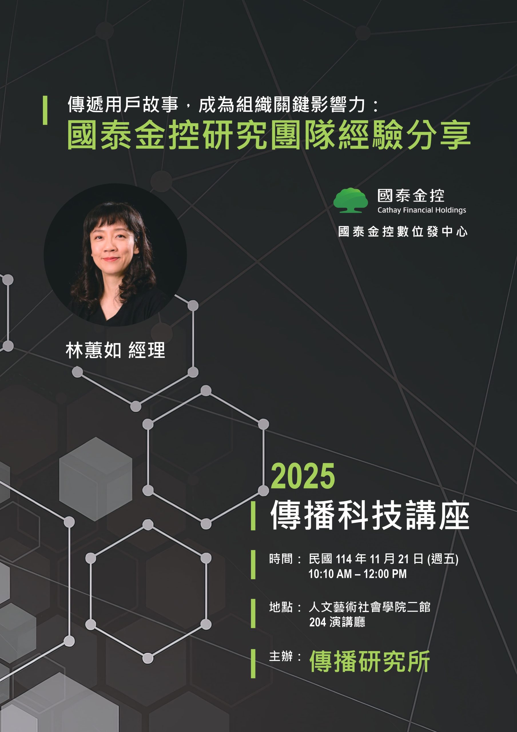 11/21 (五) 傳播科技講座課程,邀請到國泰金控數數發中心 體驗研究科 的 林蕙如經理 前來所上演講,歡迎各位同學踴躍參與。