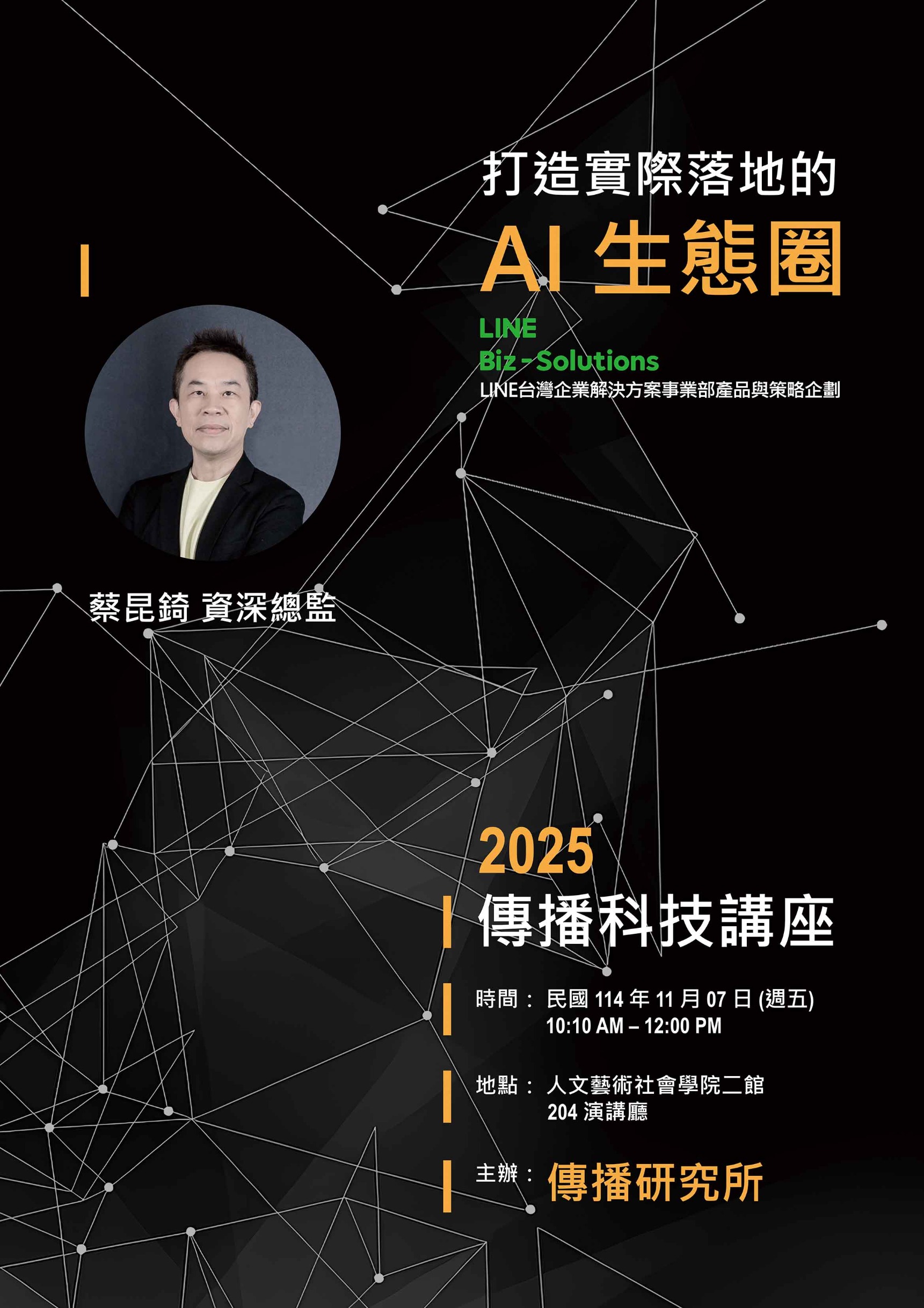 11/7 (五) 傳播科技講座課程,邀請到LINE台灣企業解決方案事業部產品與策略企劃 的 蔡昆錡資深總監 前來所上演講,歡迎各位同學踴躍參與。